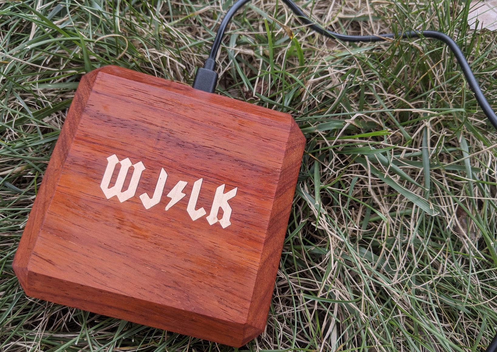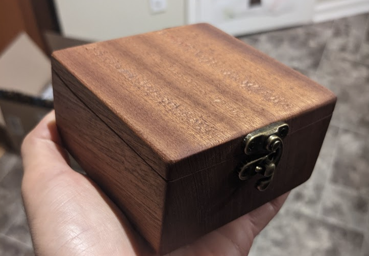 Wood enclosure for wireless charger for engaged couple; padauk and maple, CNC