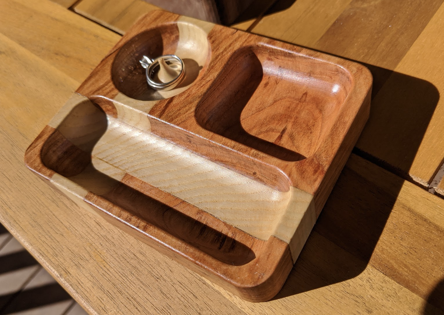 Engagement jewelry dish for a friend; cherry and rock maple, CNC