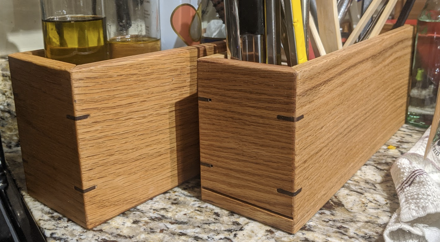 Matching kitchen boxes for cooking utensils and oil; red oak and walnut