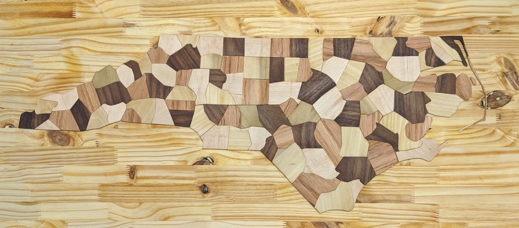 County map of North Carolina; black walnut, maple, red oak, and poplar on pine, CNC
