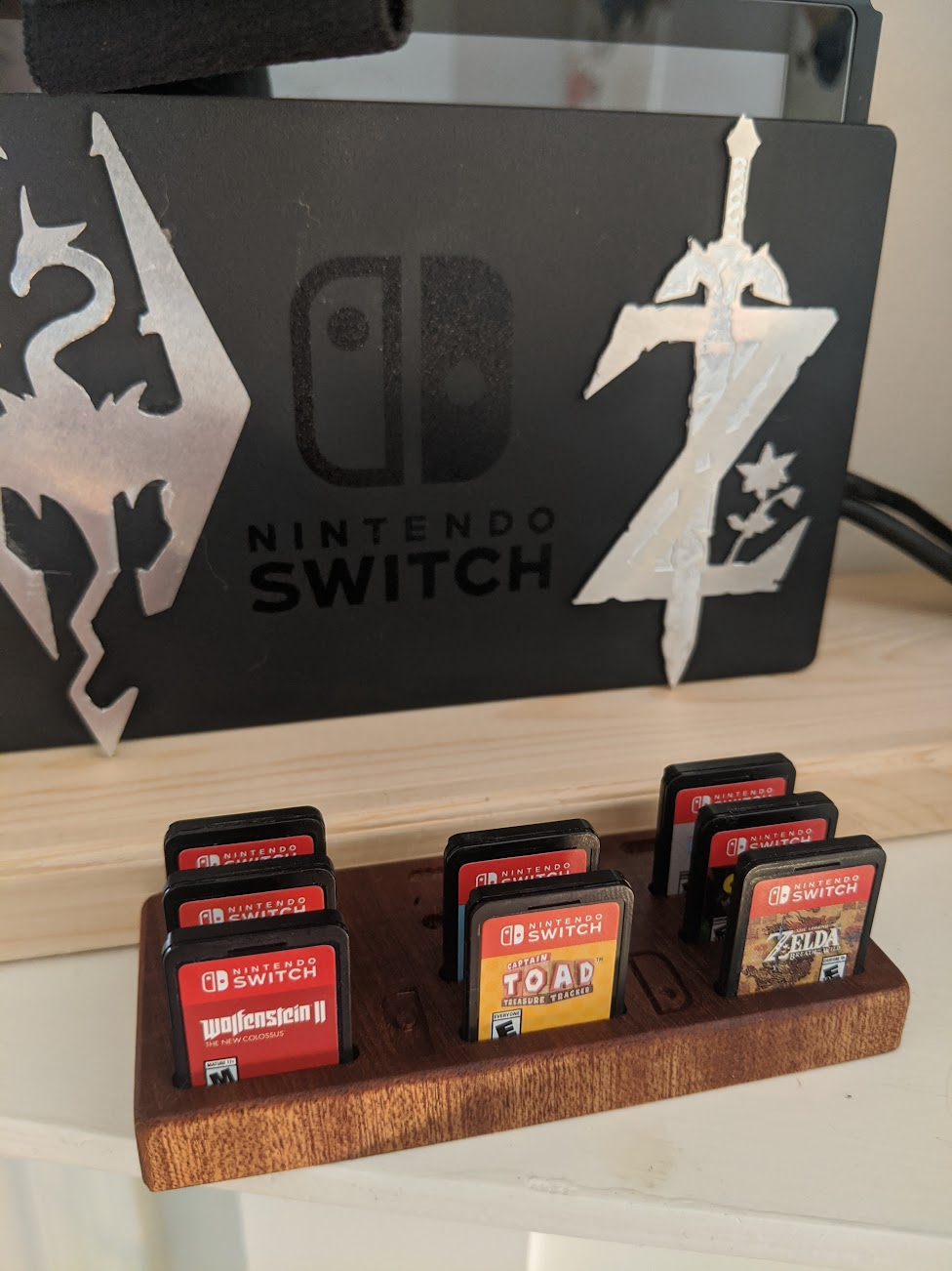 Nintendo Switch cartridge stand; sapele, CNC. Also pictured: Aluminum logos from Skyrim and Breath of the Wild
