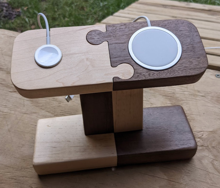 Apple Watch and iPhone stand; black walnut and hard maple, CNC