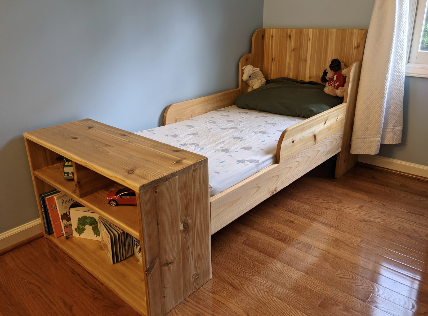 A toddler bed with shelves, for my first son, Atlas; cedar