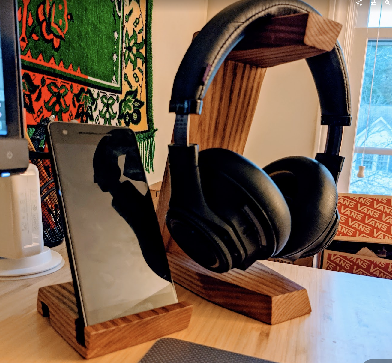 Matching phone and headphone stands; red elm