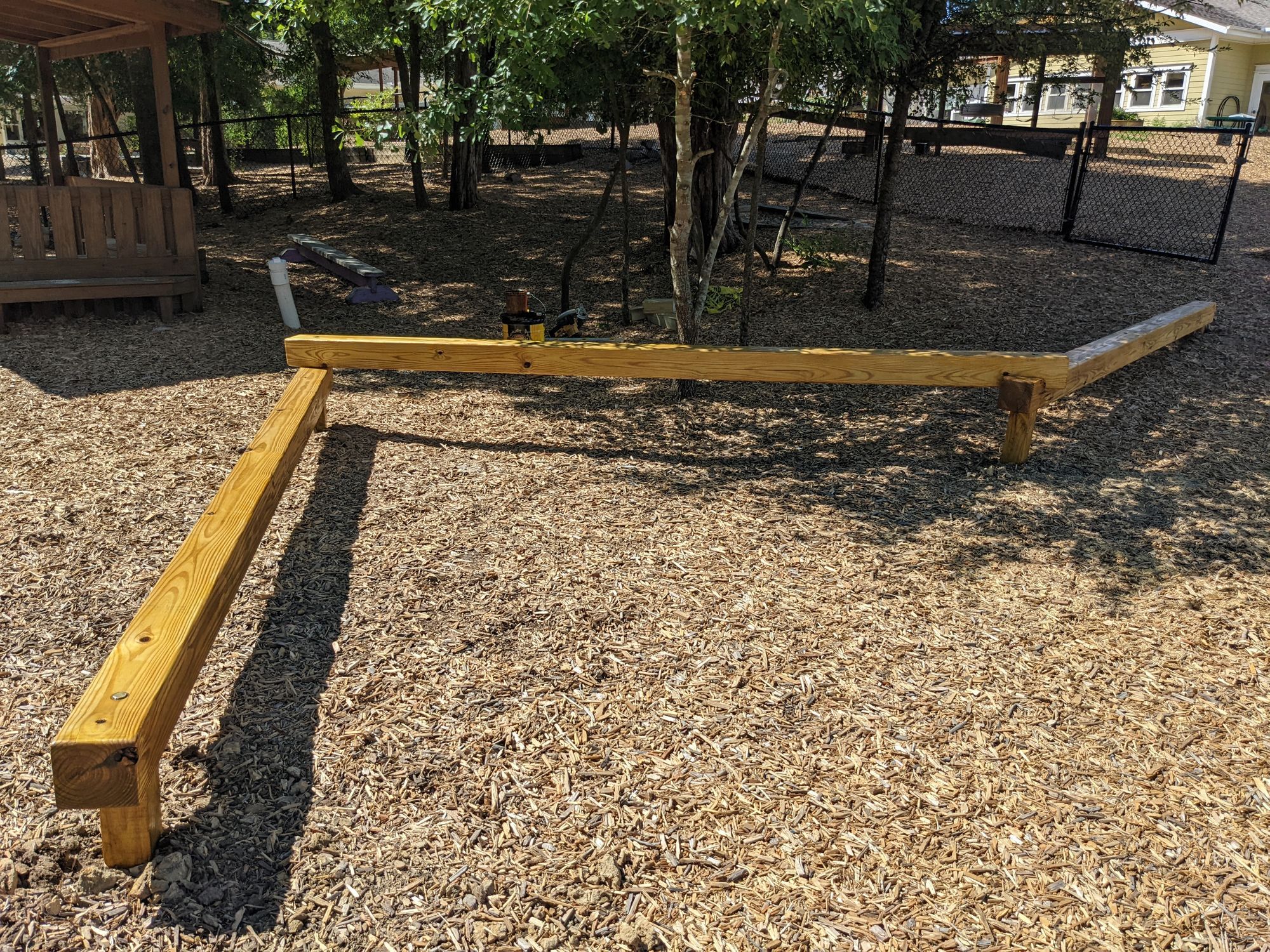 Balance beam for charity, childrens' playground; three 12' 6"x6" sections mortised onto cemented footers.