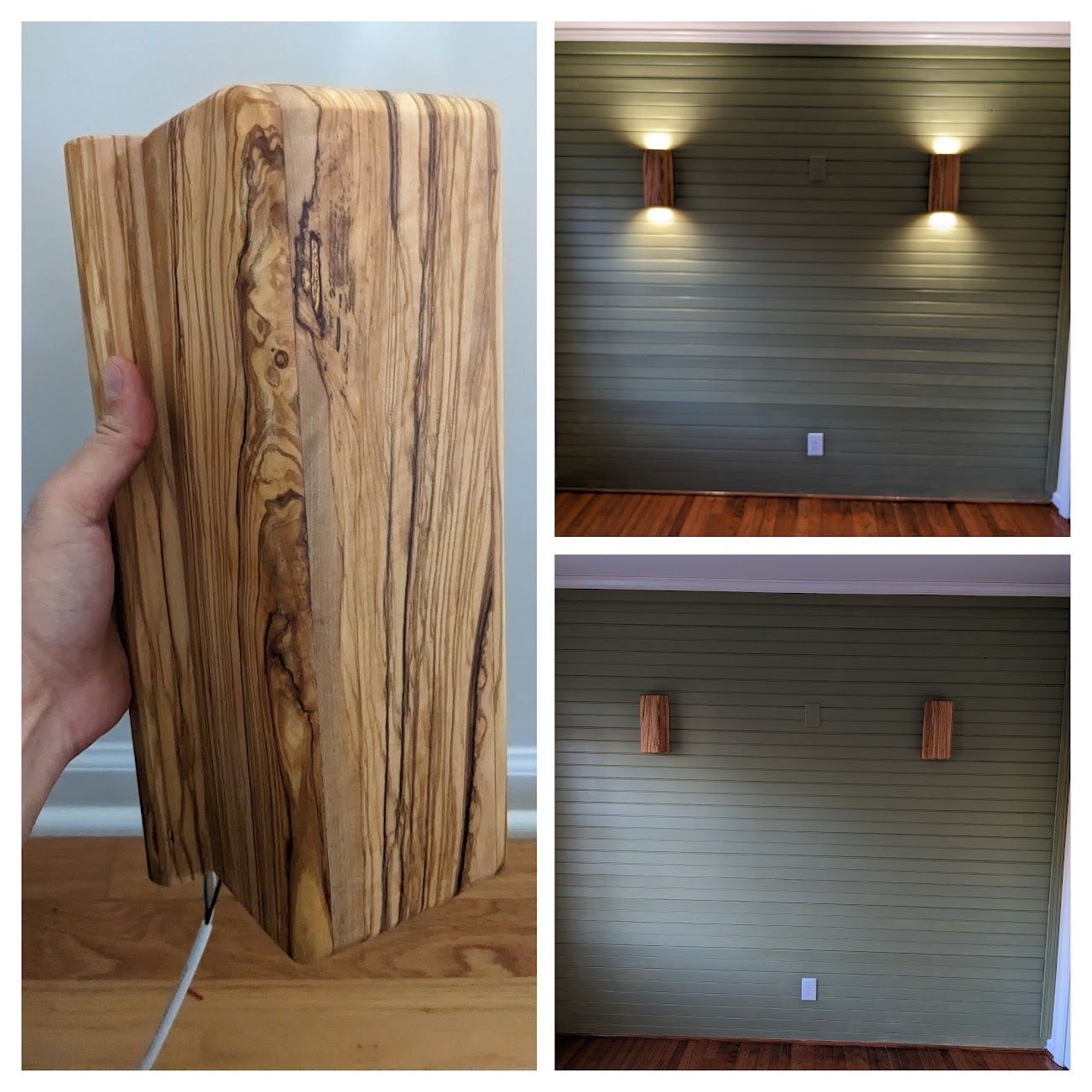 Tongue-and-groove accent wall with custom sconces; olive wood